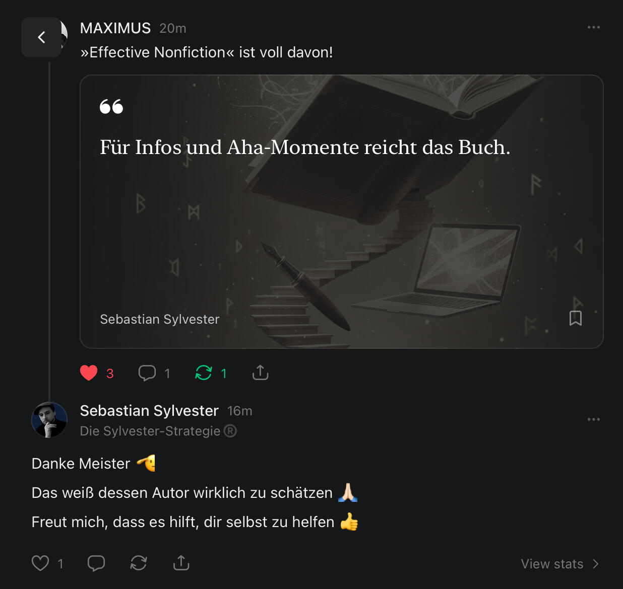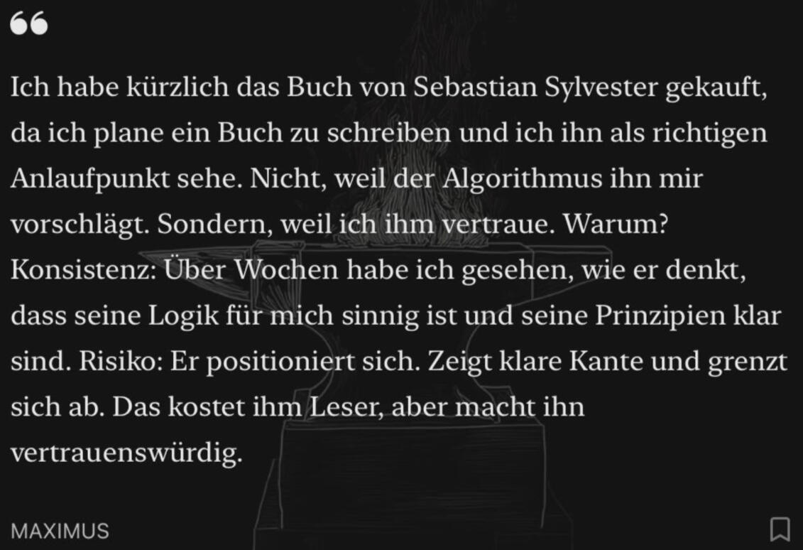 und sein Online-Kurs »Der 4-Stunden-Autor« gilt als »das Ausbildungs-Programm für Sachbuch-Autoren.«Der digitale Autor legt großen Wert auf zeitlose Prinzipien, welche er in sein Leben und Schaffen implementiert.Sebastian Sylvester schreibt, im Vermächtnis Verlag, sein eigenes Vermächtnis mit spitzer Feder.